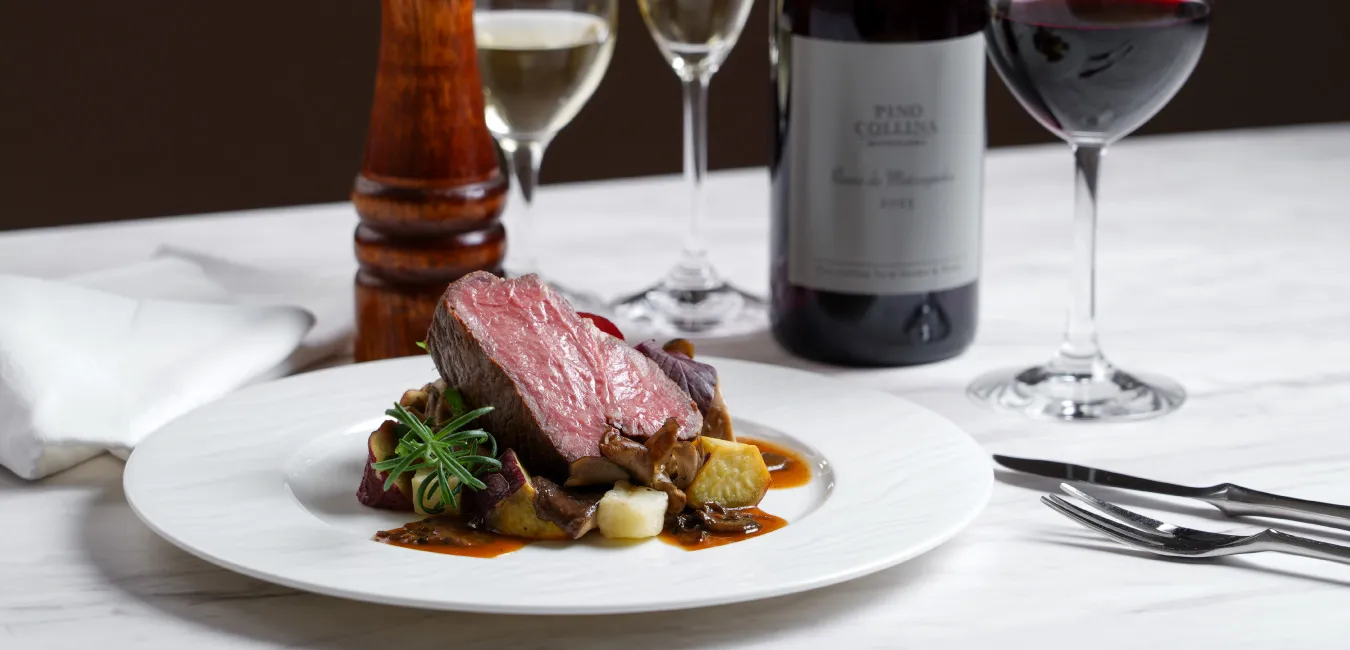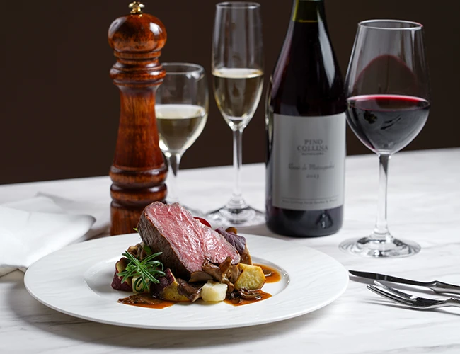 芳醇な香りの山形牛ローストには、松ヶ岡産の濃厚な赤ワインを合わせることで、肉の旨味とワインの果実味が絶妙なハーモニーを奏でます。