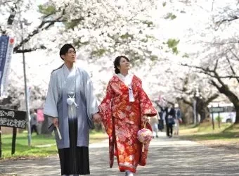 ウェディング今年も馬渡の川沿いの桜並木で、春のロケーションフォトウェディング