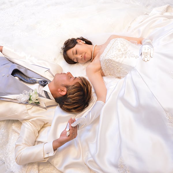 ウェディングドレスをふんわり広げた寝転びショットは息を飲むほどロマンチック