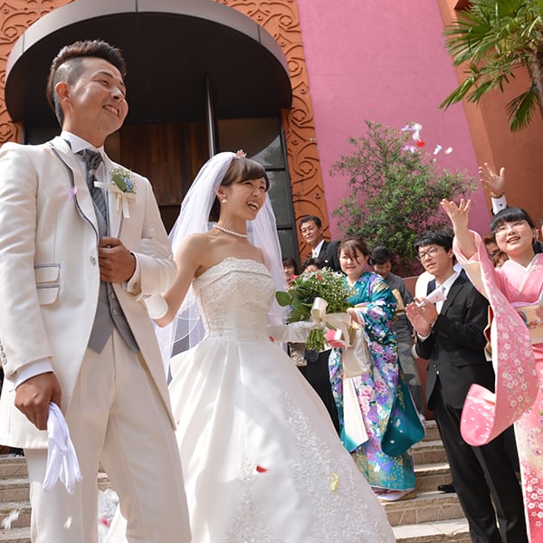 チャペル挙式ではゲストにフラワーシャワーでお祝いしてもらいました