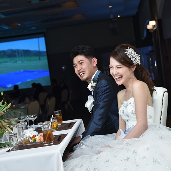 ご友人の余興は映像でお二人もゲストも笑顔に