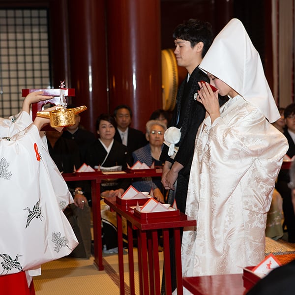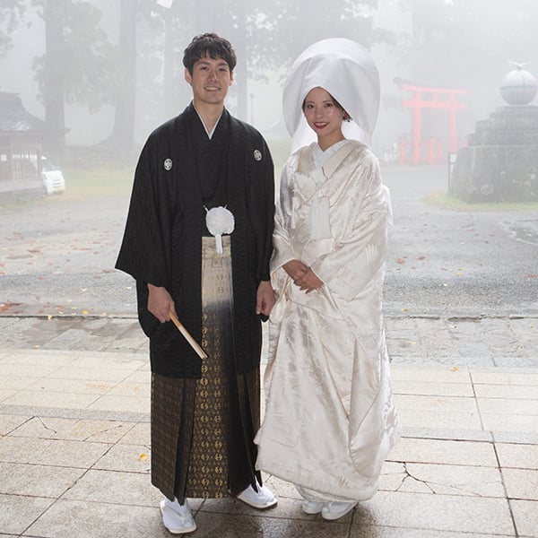 出羽三山神社での神前式は厳かで圧倒的な雰囲気が人気。盃を交わして夫婦の契りを結びました