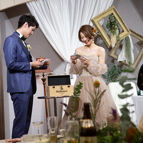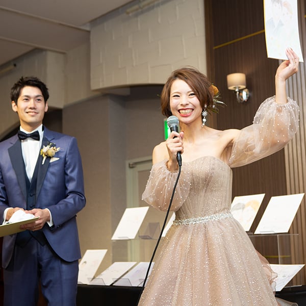 新郎新婦の似顔絵をグループごとにゲストに描いてもらい、お二人が審査して選出