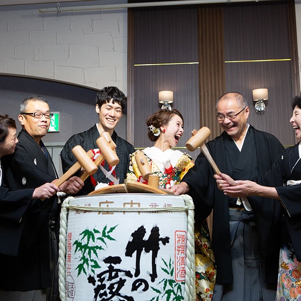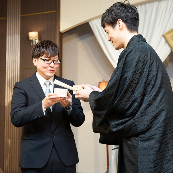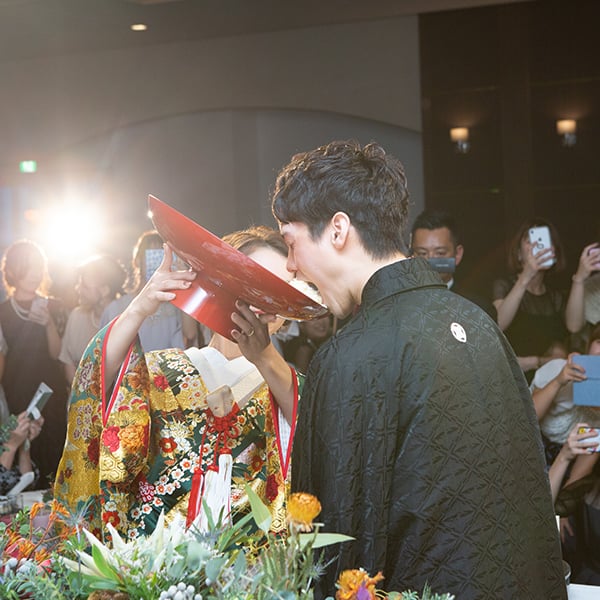 大きな赤盃を使ってちょっと変わった和装ならではのファーストバイト