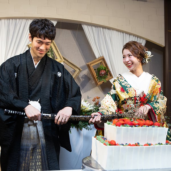 和装でのウェディングケーキ入刀は模造刀にて行いました。斬新で素敵な演出です