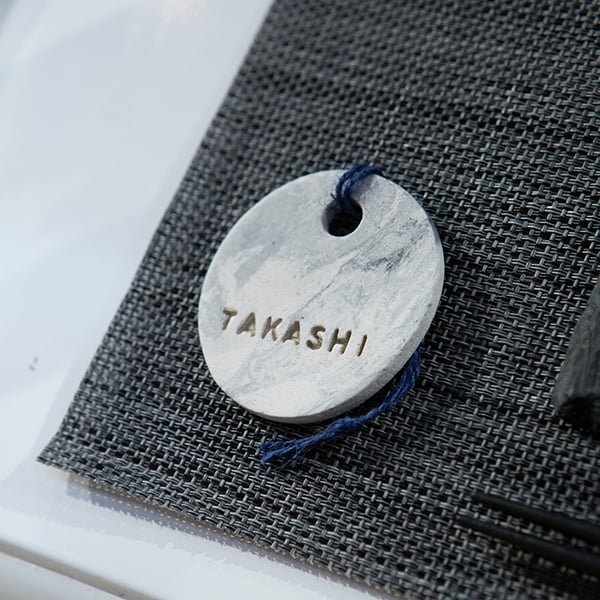 石粉粘土にひとつひとつ名前を彫って手づくりしたネームタグ