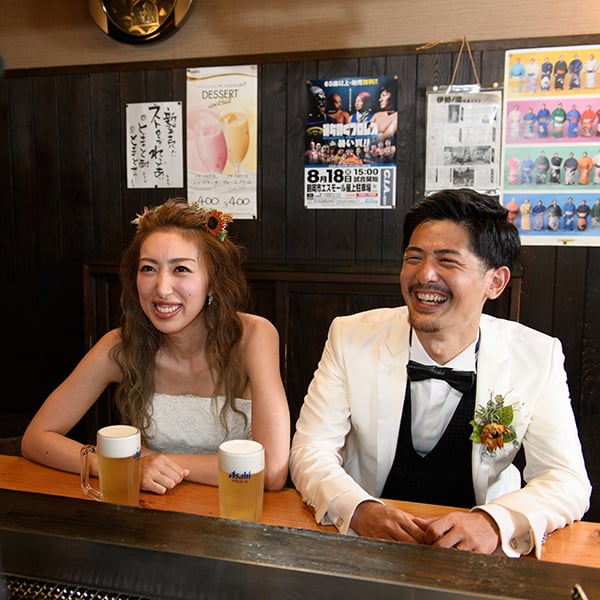 お二人の出会いのきっかけとなった居酒屋での前撮り。リアルなビールは新婦さんがゼリーで作ったもの