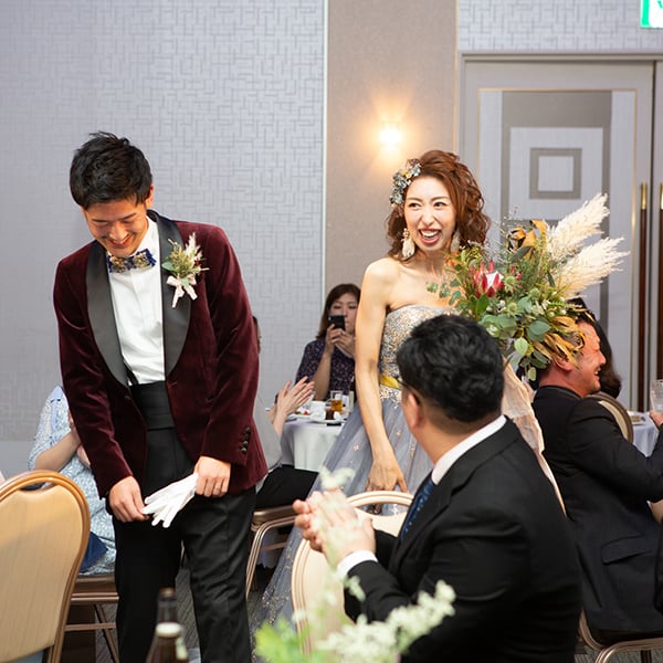 入場曲を歌ってくれた友人に先導されながらのお色直し入場