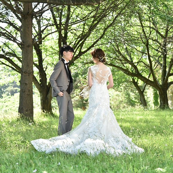 ウェディングドレスが緑地によく映えます。残したい写真は前撮りでゆったりとした気持ちで