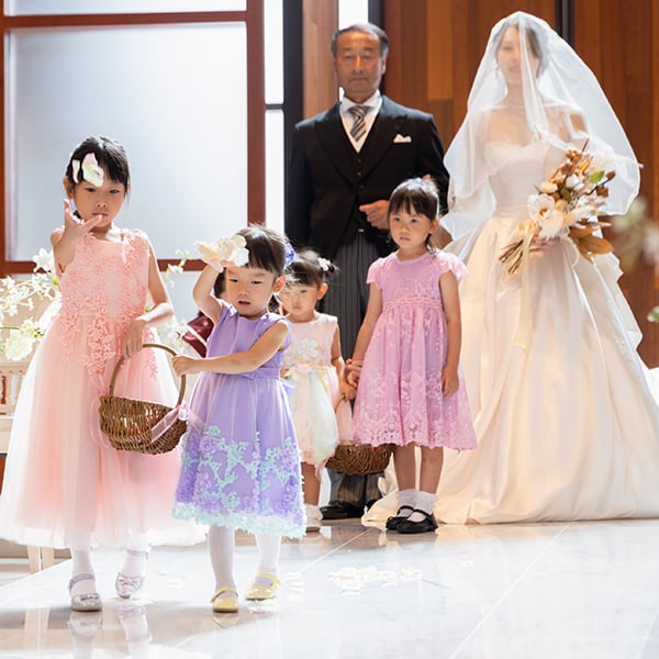花びらをまきながら花嫁の前を歩くフラワーガール