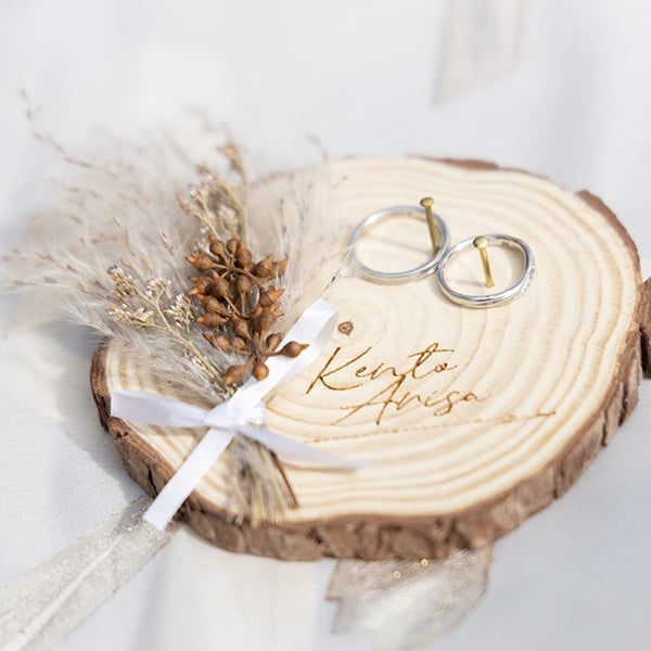 ガーデン人前式に合わせた丸太のリングピロー 装花は自然の中にいるような草花たちを