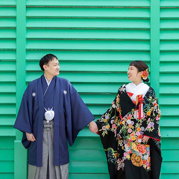 鮮やかな壁の前で和装での前撮り