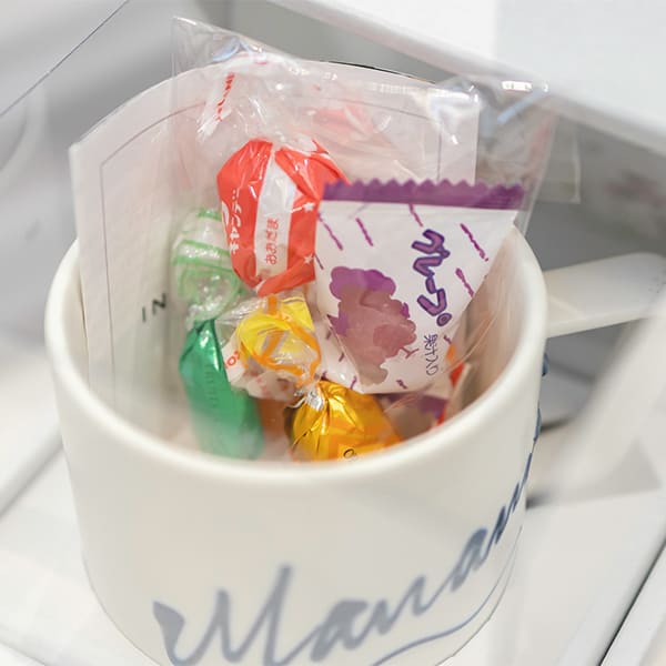 ネームカード代わりのオリジナルマグカップ キャンディーを添えて