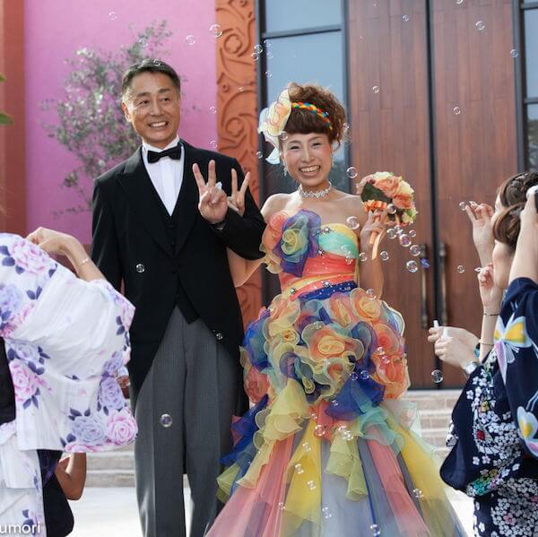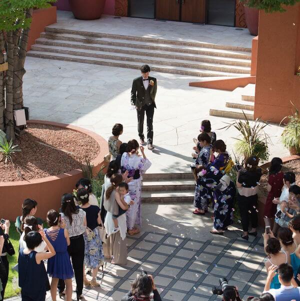 みんなに祝福されながらお父様にエスコートされて入場。花火の日なのでゲストも浴衣で大勢参加してくれました