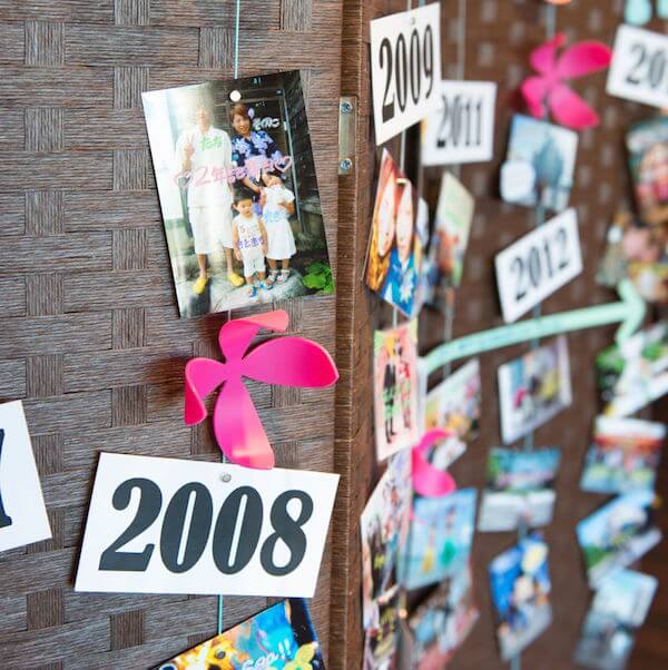 2人が出会ってから8年間の思い出を。タペストリーに仕立てあげたウェルカムコーナー