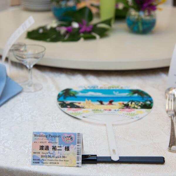 ディズニー好きの2人。席札とうちわ、そしてPartyの入場パスポートは全て手づくり