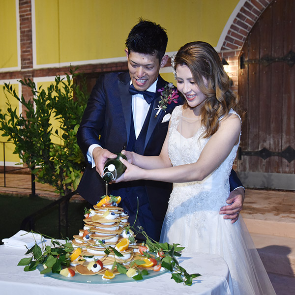 ハワイアン風をテーマにしてパンケーキにはちみつをかける演出