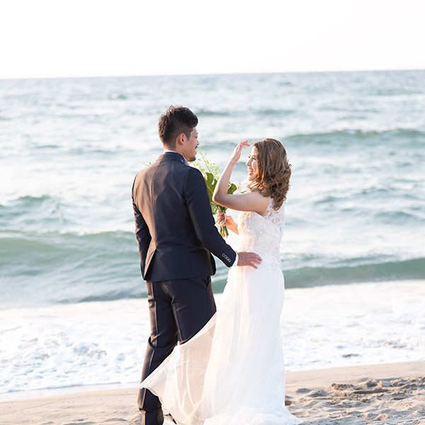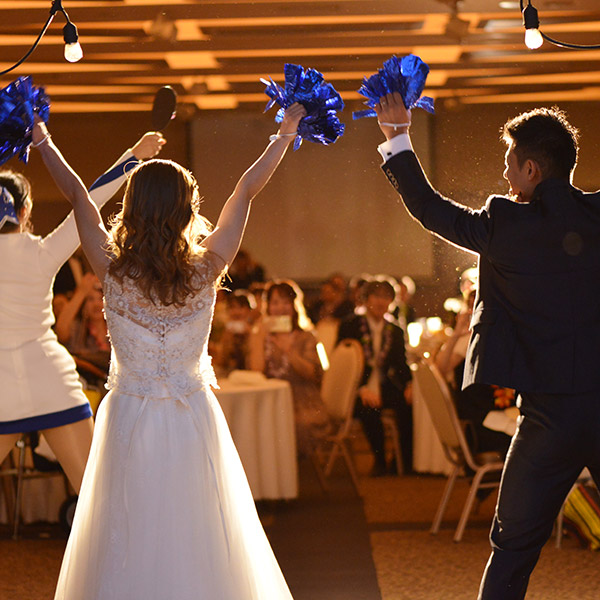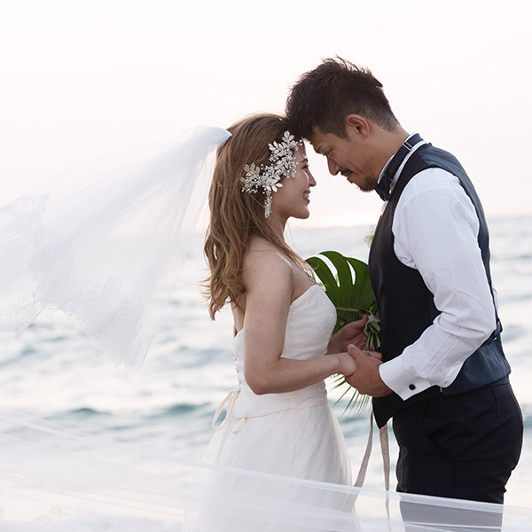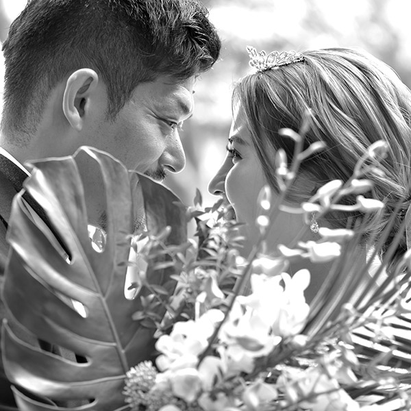 ハワイアンらしいトロピカルなブーケを合わせてウェディングドレスにチェンジ