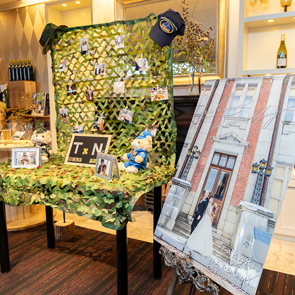 自衛隊の新郎様をイメージしやすいよう迷彩柄のウェルカムスペースに