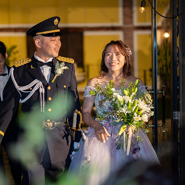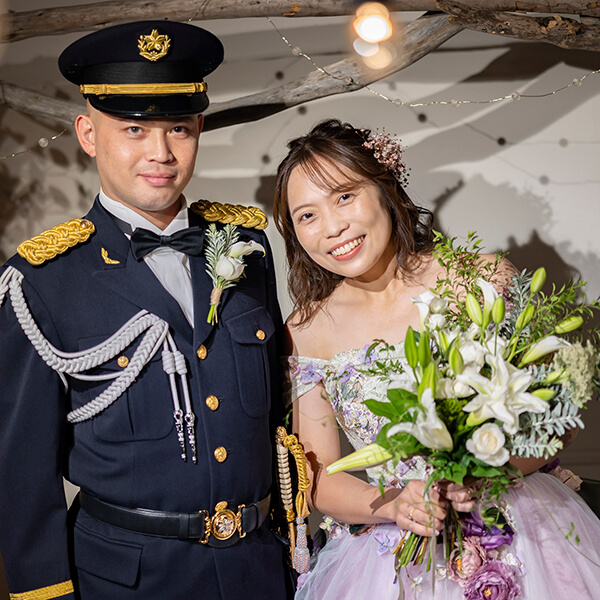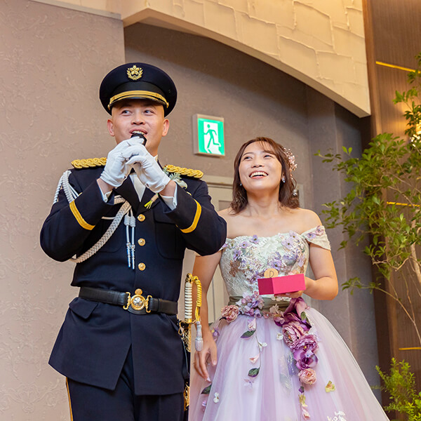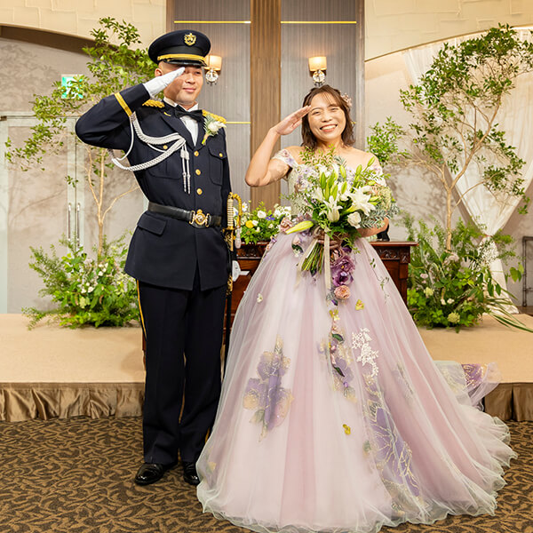 自衛隊の新郎様と敬礼ポーズで