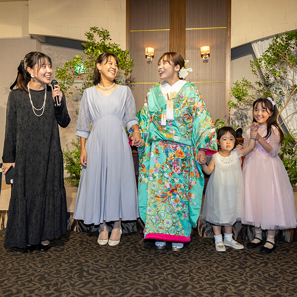 和装入場 会場レイアウトは長卓でゲストの顔が見渡せるスタイルで