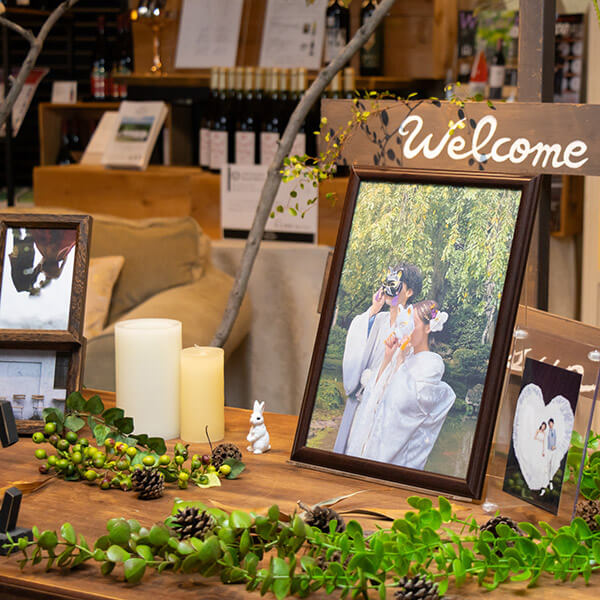 森をイメージしたウェルカムコーナー 前撮り写真と合わせながらのナチュラルなコーナーに