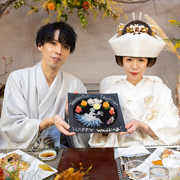 調理メンバーからのサプライズプレート ふぐを使って新郎新婦を表現した一皿