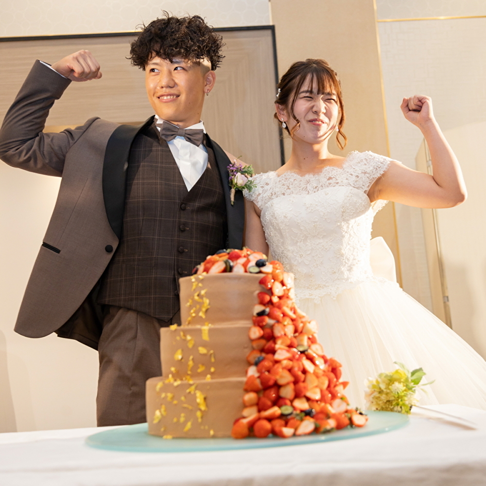 ケーキ入刀前にはマッスルポーズで気持ちを高めます!