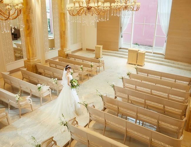 壮麗なチャペルの大理石と優しく差し込む光が、華麗なドレスを身にまとった花嫁の美しさを一層際立ててくれます。